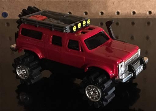 Who remembers Dante's Peak? Before getting melted in lava, the big red Suburban was a fun part of the movie. Adding a roof rack, snorkle and spare tire are just part of bringing this one to life. The other secret is melding two blazer chasises together and putting them on a military half track chassis.